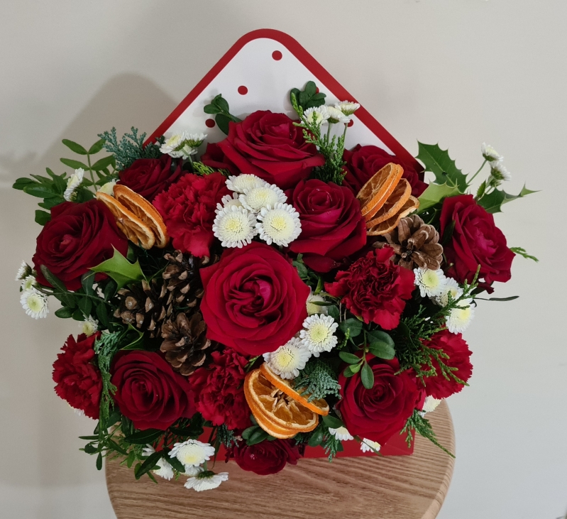 Festive season envelope flowers box arrangement with red roses, carnations, pine cones and orange slice.